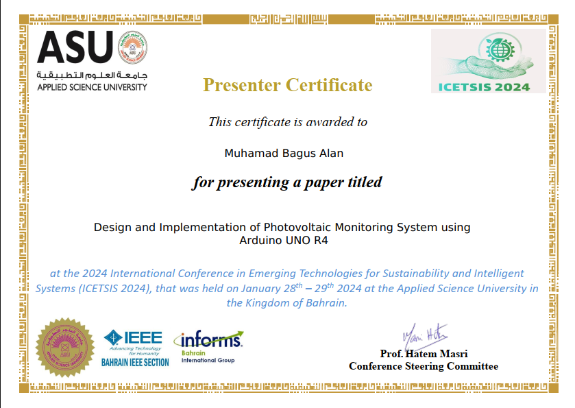 Penelitian berkolaborasi dengan dosen tentang Design and Implementation of Photovoltaic Monitoring System using Arduino UNO R4