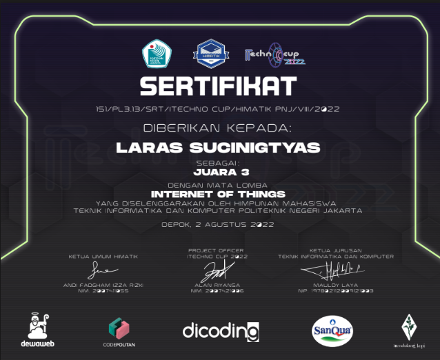 - Juara 3 Nasional Lomba Inovasi IoT oleh Politeknik Negeri Jakarta Tahun 2022Source