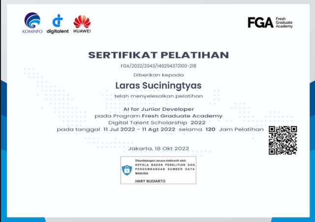 - Fresh Graduate Academy AI For Junior Developer Huawei oleh Kementrian Komunikasi dan Informatika RI Tahun 2022Source