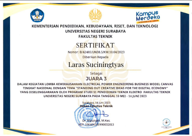 - Juara 3 Nasional Bussines Model Canva oleh Universitas Negeri Surabaya Tahun 2023Source
