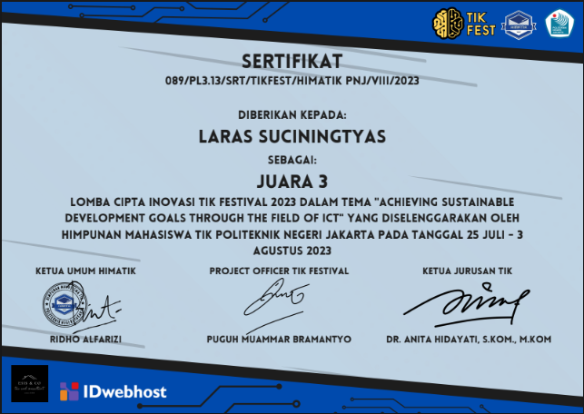 - Juara 3 Nasional Lomba Cipta Inovasi TIK oleh Politeknik Negeri Jakarta Tahun 2023Source